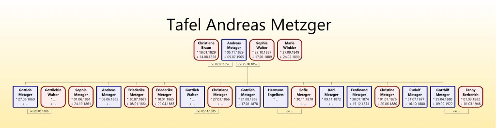 Der zweiten Ehe von Andreas Metzger 1929 – 1905 mit Sophia, geb. Walter (1837 – 1889), entstammten 13 Kinder. 7 Kinder sind bereits im Kleinkindalter verstorben. Das Erwachsenenalter erreicht haben 6 Kinder: