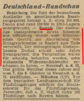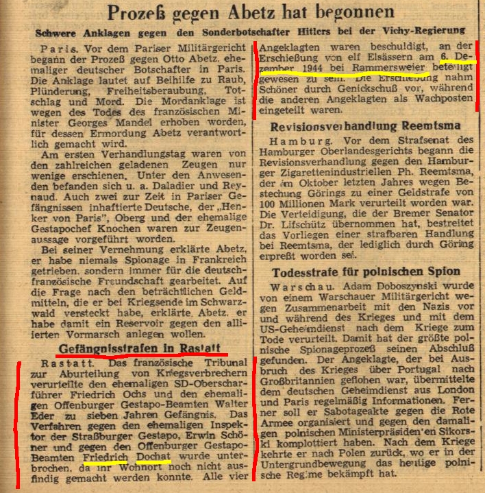Bei meiner Recherche nach Friedrich Dochat bin ich auf einen Artikel des Südkuriers vom 14. Juli 1949 gestoßen. In dem Artikel wird Friedrich Dochat im Rahmen der Rastatter Prozesse erwähnt. Vor dem französischen Tribunal zur Aburteilung von Kriegsverbrechern wird Dochat beschuldigt, an der Erschießung von elf Elsässern aus Vieux-Thann und Umgebung am 6. Dezember 1944 auf dem Talebuckel bei Rammersweier (zwischen Offenburg und Durbach) beteiligt gewesen zu sein.