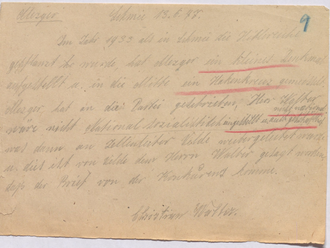 Nach einer anderen Notiz, auch vom 13.6.1947, heißt es von Albert Velte , dass ihm nicht mehr bekannt sei, wer den Brief geschrieben habe, er hätte ihn auch persönlich nicht gesehen, sondern nur vom Geschäftsführer davon erfahren. Auch sei die Rede gewesen, dass es „sich zwischen Walter Schmie und einem gewissen Mezger handelt. „Herr Velte hat dort zum Ortsgruppenführer oder Geschäftsführer gesagt, das ist nur Geschäftsneid.“