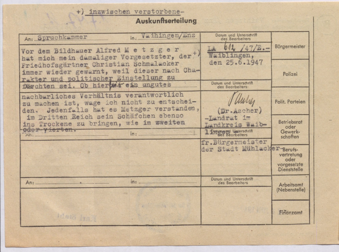 Ähnlich formuliert Dr. Ascher, der im Dritten Reich zur Arbeit auf dem Friedhof verpflichtet worden war, nach dem Krieg von der amerikanischen Militärregierung in Mühlacker als Bürgermeister eingesetzt wurde und danach Landrat in Waiblingen war, folgendes: „Jedenfalls hat es Metzger verstanden, im Dritten Reich ebenso seine Schäfchen ins Trockene zu bringen, wie im zweiten oder vierten.“ Ascher beruft sich in seiner Stellungnahme auf den ehemaligen Friedhofsgärter Christian Schmalacker, der zeitweise auf dem Heuberg inhaftiert gewesen war: „Vor dem Bildhauer Alfred Metzger hat mich mein inzwischen verstorbener Vorgesetzter, der Friedhofsgärtner Christian Schmalacker gewarnt, weil dieser nach Charakter und politischer Einstellung zu fürchten sein.“ Ascher fährt aber fort: „Ob hierfür ein ungutes nachbarliches Verhältnis verantwortlich zu machen ist, wage ich nicht zu entscheiden.“