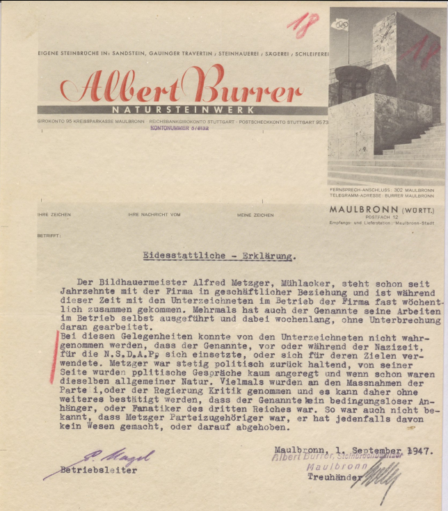 Zur Bildhauerfamilie Metzger aus Schmie gehörten auch Alfred Metzger und sein Sohn Manfred Metzger in Mühlacker; Alfred – er war der Sohn von Gottlob Metzger – hat, nachdem er 1923 den väterlichen Betrieb übernommen hatte, den Bildhauerbetrieb nach Mühlacker verlegt. Auf der Suche danach, ob auch aus seiner Werkstätte jüdische Grabmale stammten, wurde ich nicht fündig, aber ich bin auf etwas anderes gestoßen. Im Staatsarchiv befinden sich die Verfahrenakten von Alfred Metzger. Laut Meldebogenwar Alfred Metzger Mitglied verschiedener NS-Organisationen, wie dem NSV, dem DAF oder dem NS-Reichkriegerbund. Ob er auch und vor allem ab wann er Mitglied der NSDAP war, erscheint unklar. Im 1937 gestellten Aufnahmeantrag in die Reichskammer der bildenden Künste ist jedenfalls keine Parteimitgliedschaft erwähnt, was letztlich zur Entlastung bei der Entnazifizierung geführt hat.