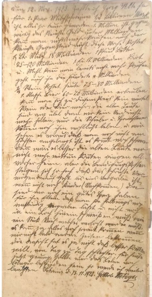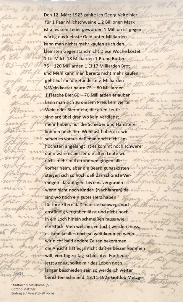 Bei der Durchsicht des Buches ist mir aufgefallen, dass Gottlob Metzger nicht nur die Löhne seiner Mitarbeiter verzeichnet hat, sondern auch allerlei Zeitgeschichtliches dokumentiert hat. Unter anderem die hohe Inflation der 1920er Jahre.