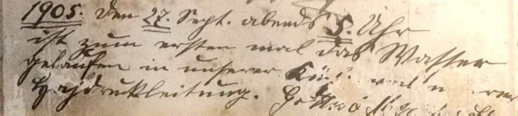 1905 den 27. Sept abends 5 Uhr ist zum ersten mal das Wasser gelaufen in unserer Küche in unserer Hochdruckleitung. Gottlob Metzger